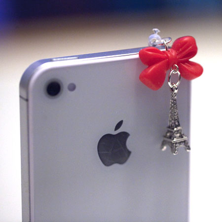 This is a Super Cute (Kawaii) MINI EIFFEL TOWER with DARK PINK RIBBON ear plug that fits into a 3.5mm headphone jack : iphone 4/4G/3G, HTC, Blackberry, iPad 1/2, other product with 3.5mm headphone jack.