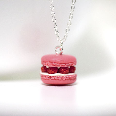 Kawaii Cute Miniature Food Necklaces - Raspberry Macaron with Sterling Silver Chain