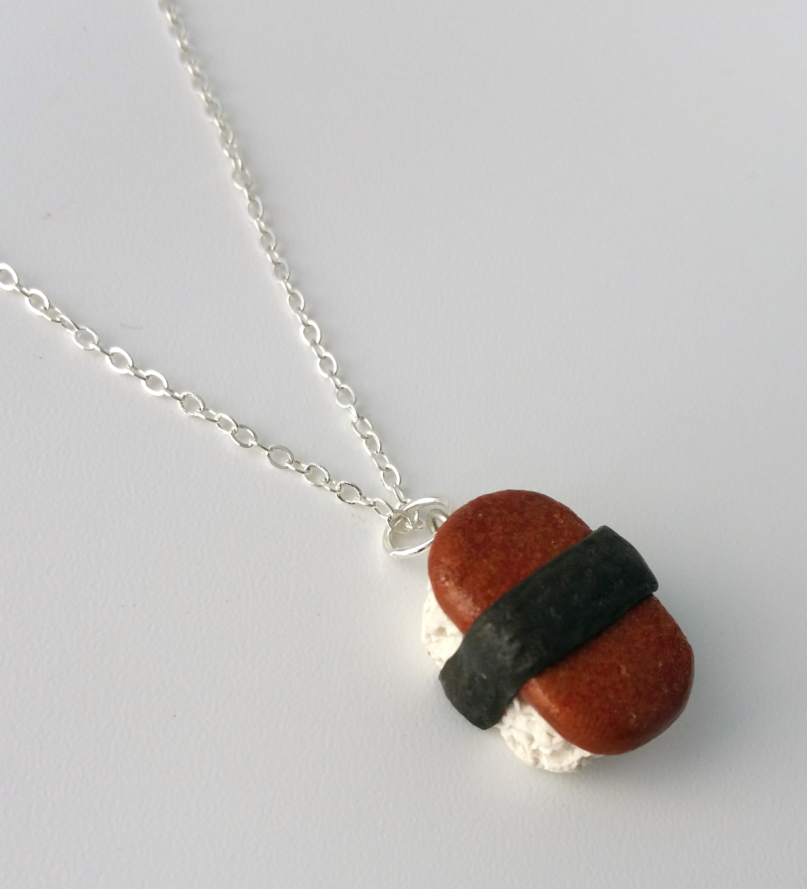 Kawaii Cute Miniature Food Necklaces - Spam Musubi with Sterling Silver Chain